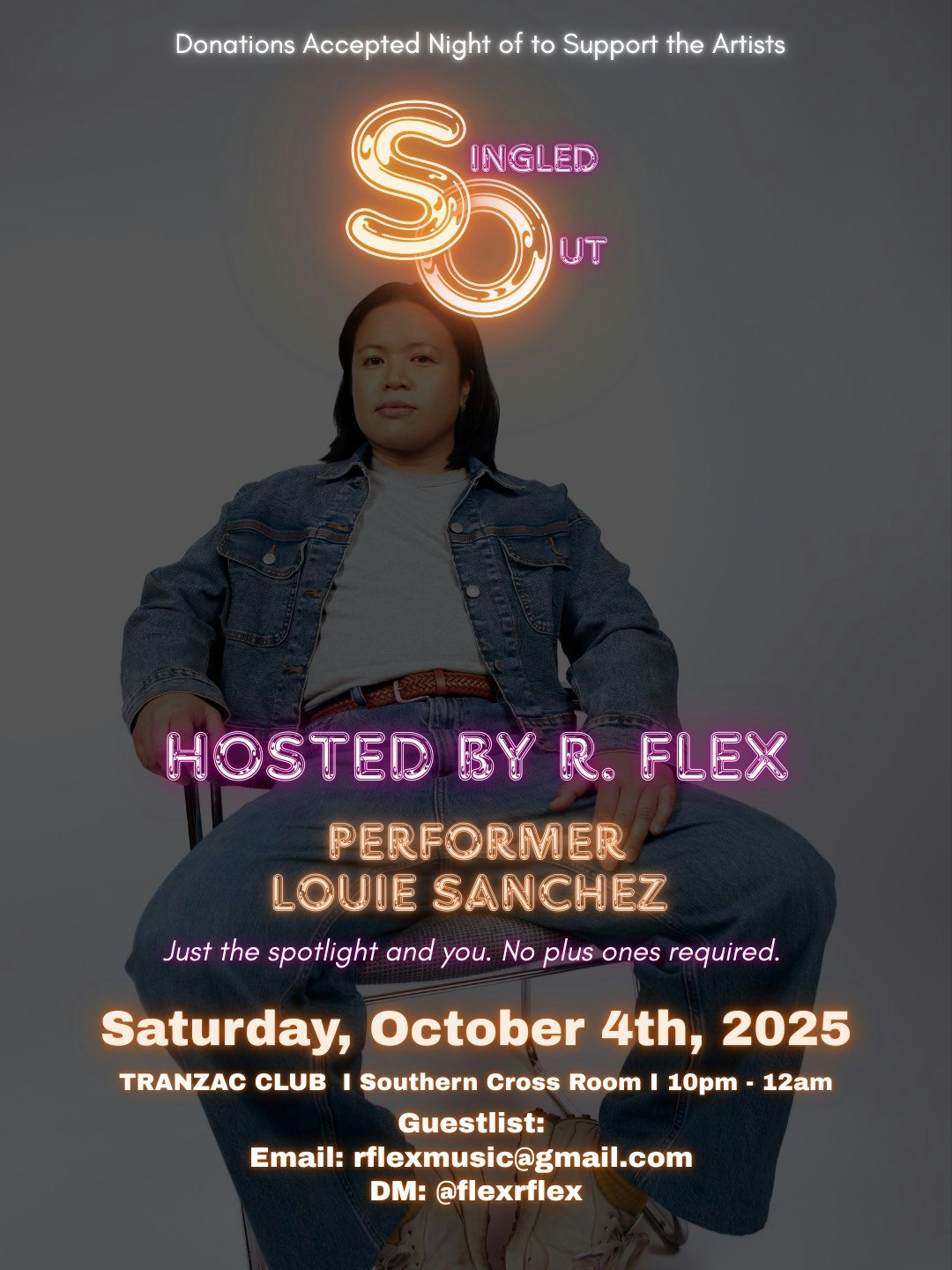 Kick off R. Flex's six month residency, Singled Out, with Louie Sanchez on Saturday, October 4th, 2025. Watch Sanchez weave together stories of labour, loss, and longing through a blend of country, pop, and R&B. Their songs invite each listener into a vivid portrait of Filipino-Canadian working class life. Don't miss this debut performance with R. Flex leading the night.