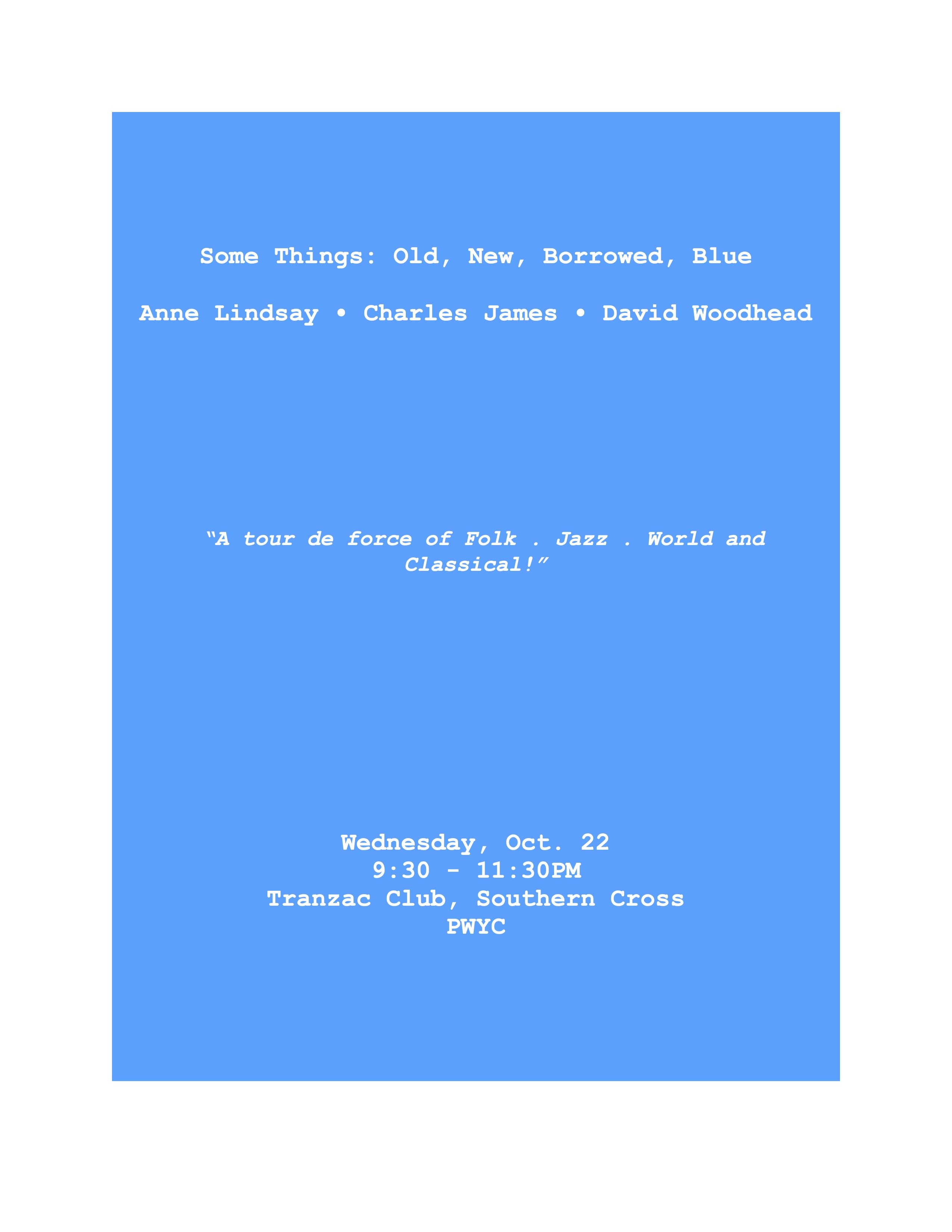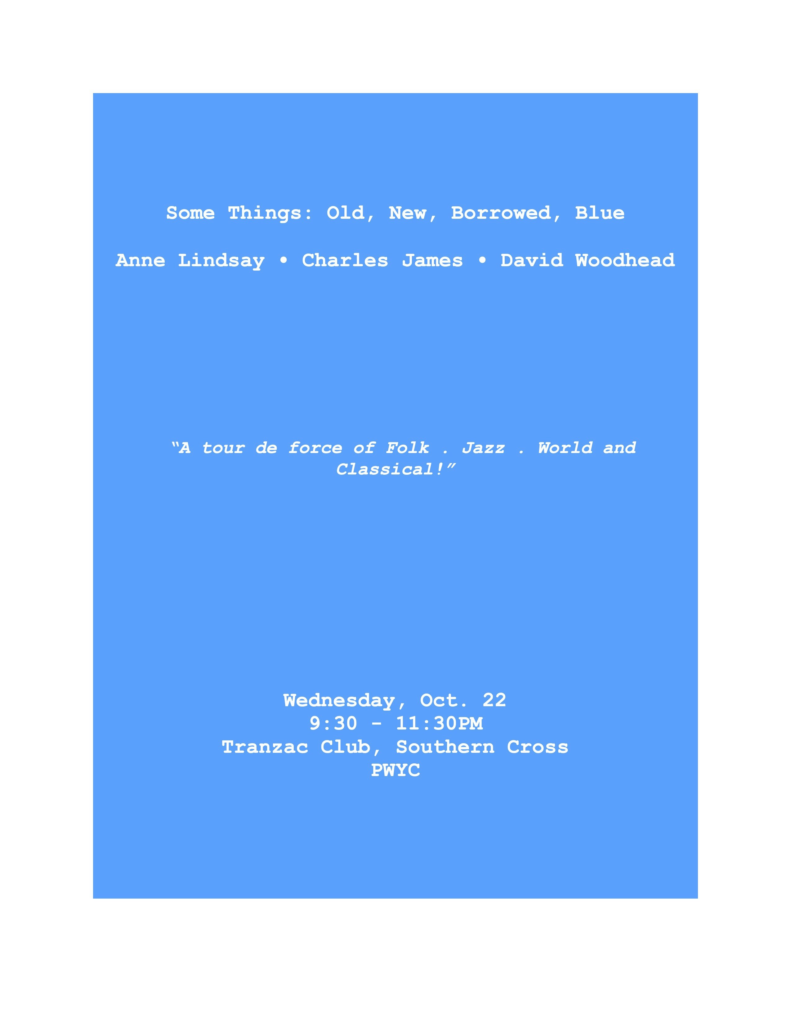 Lindsay . Woodhead . James . “A tour de force of Folk . Jazz . World and Classical!” Anne Lindsay, David Woodhead and Charles James join musical forces - their collective cup runneth over with adventurous original compositions and unlikely adaptations.