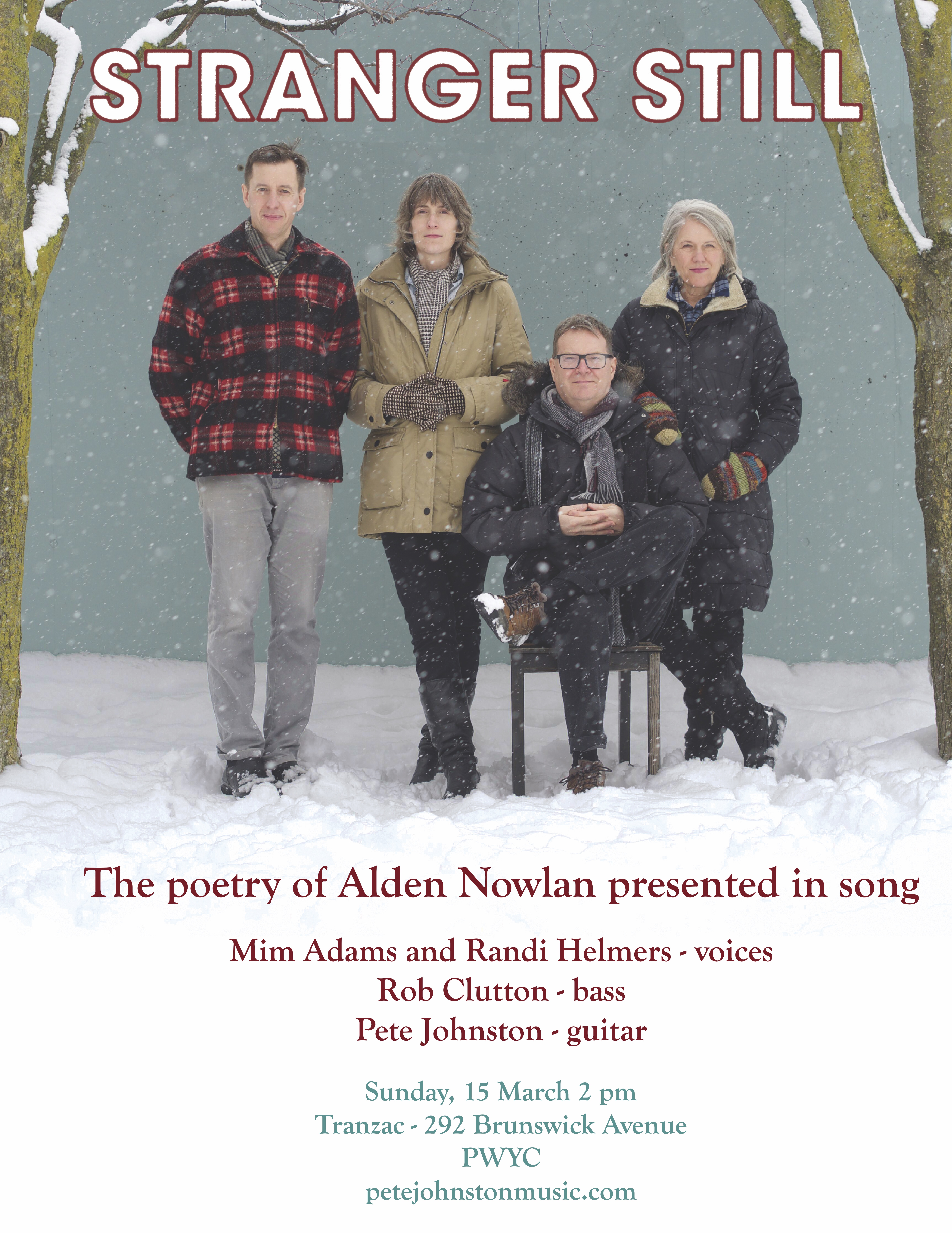 "Stranger Still returns to offer more Alden Nowlan poems set to music from our forthcoming album We Might Not Tell Everybody This. If you are looking for something to do between church and supper on the Ides of March, please join Rob Clutton, Mim Adams, Randi Helmers and Pete Johnston as we launch some new music out into the world."