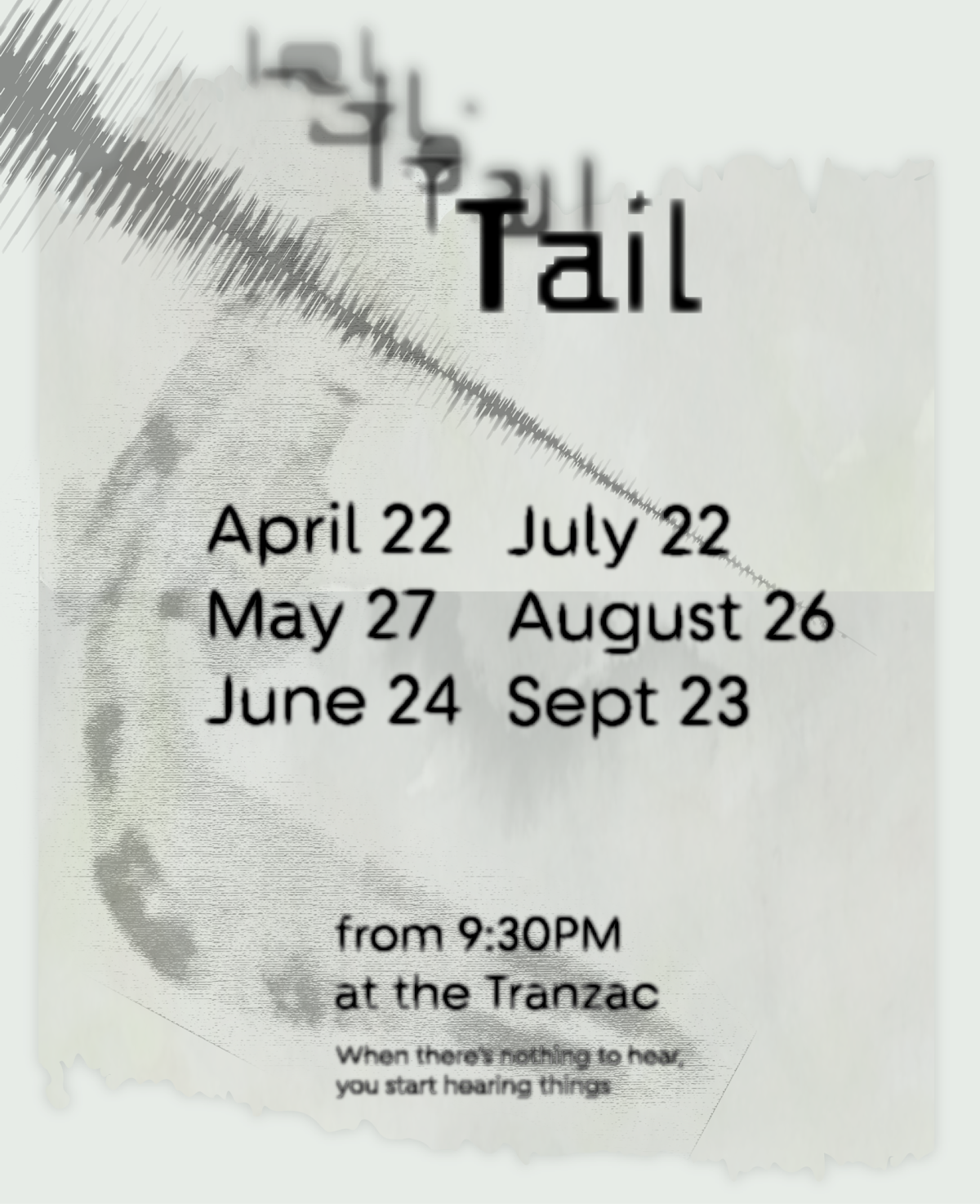 "I’m excited to announce Tail, a performance series happening every fourth Wednesday throughout the summer! This residency features alternative timbres of listening through the unspeakable and intimate. Witness, participate, orientate, and be haunted through sound and music. Performances between Enzo Sun and invited guests.