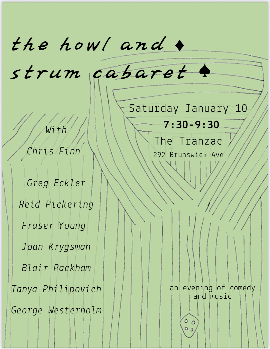 The Howl and Strum Cabaret is a blend of some of the best, most established, singer/songwriters and comedians in the city, and beyond. Toronto once had many such evenings but they seem scarce these days so we're bringing back this style of variety show! A nod to entertainment styles that mesh perfectly in a smaller setting... like Yorkville in the 60's, and like the East Village in the early 2000's, the Howl and Strum Cabaret is a perfect Saturday evening distraction in these insane times.