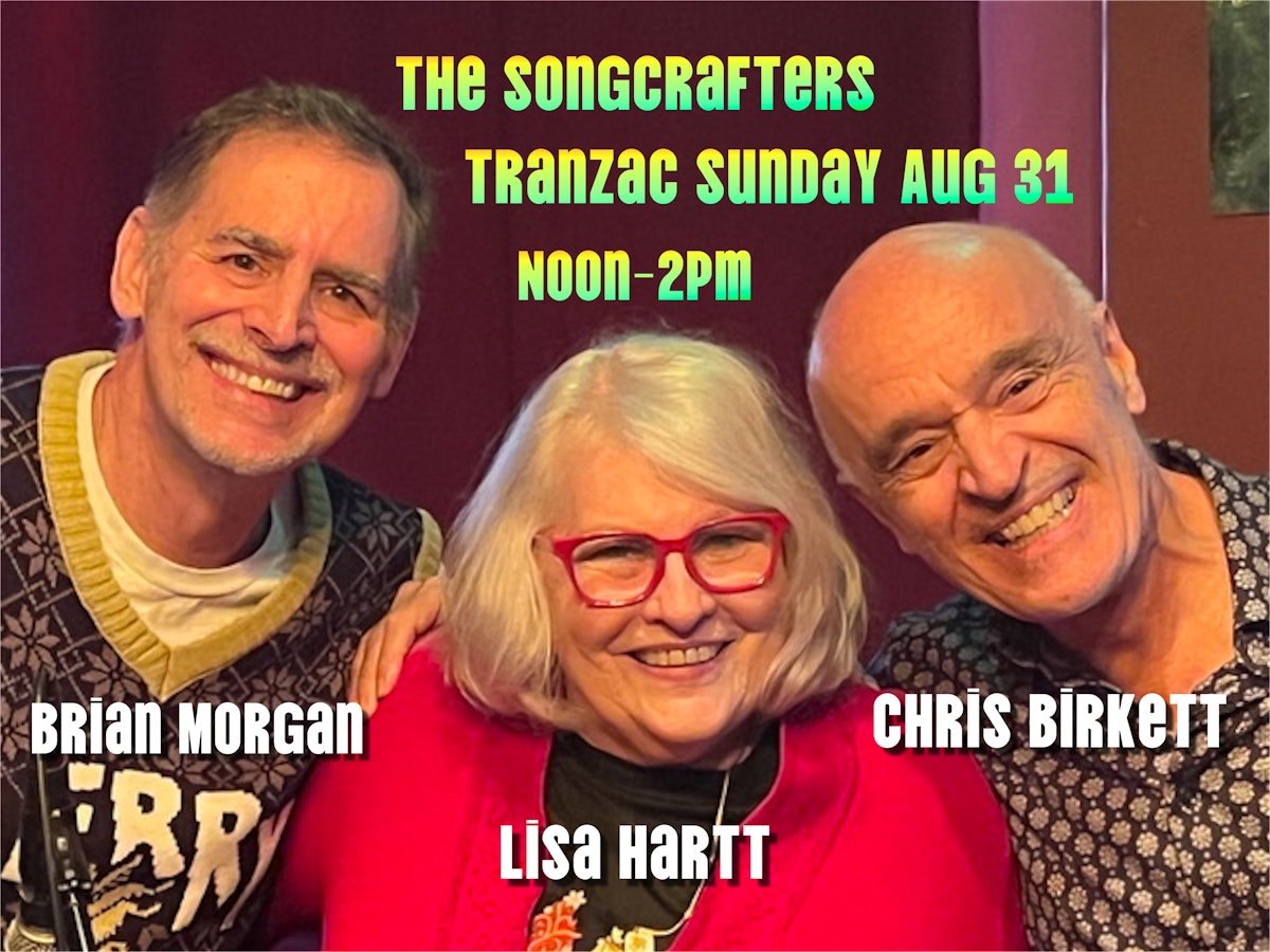 “August is like the Sunday of Summer”, a saying that suggests passages, calm reflection, and hopeful renewal. On the last Sunday of this August, the Songcrafters—Chris Birkett, Lisa Hartt, and Brian Morgan—will be performing at the Tranzac Club on Brunswick Ave. No guarantees on personal transitions, but we do promise finely crafted originals and a few favourite covers in the musical mix. Chris is an award-winning producer, a wonderful multi-instrumentalist, and a composer with a keen activist’s eye on the hypocrisies of our day. Lisa writes and sings with full emotions and vulnerabilities on display, daring us to do the same. Stories of travel—with fiddle and guitar in hand—seem to be recurring themes in many of Brian’s originals. Come see the Songcrafters and judge for yourself.