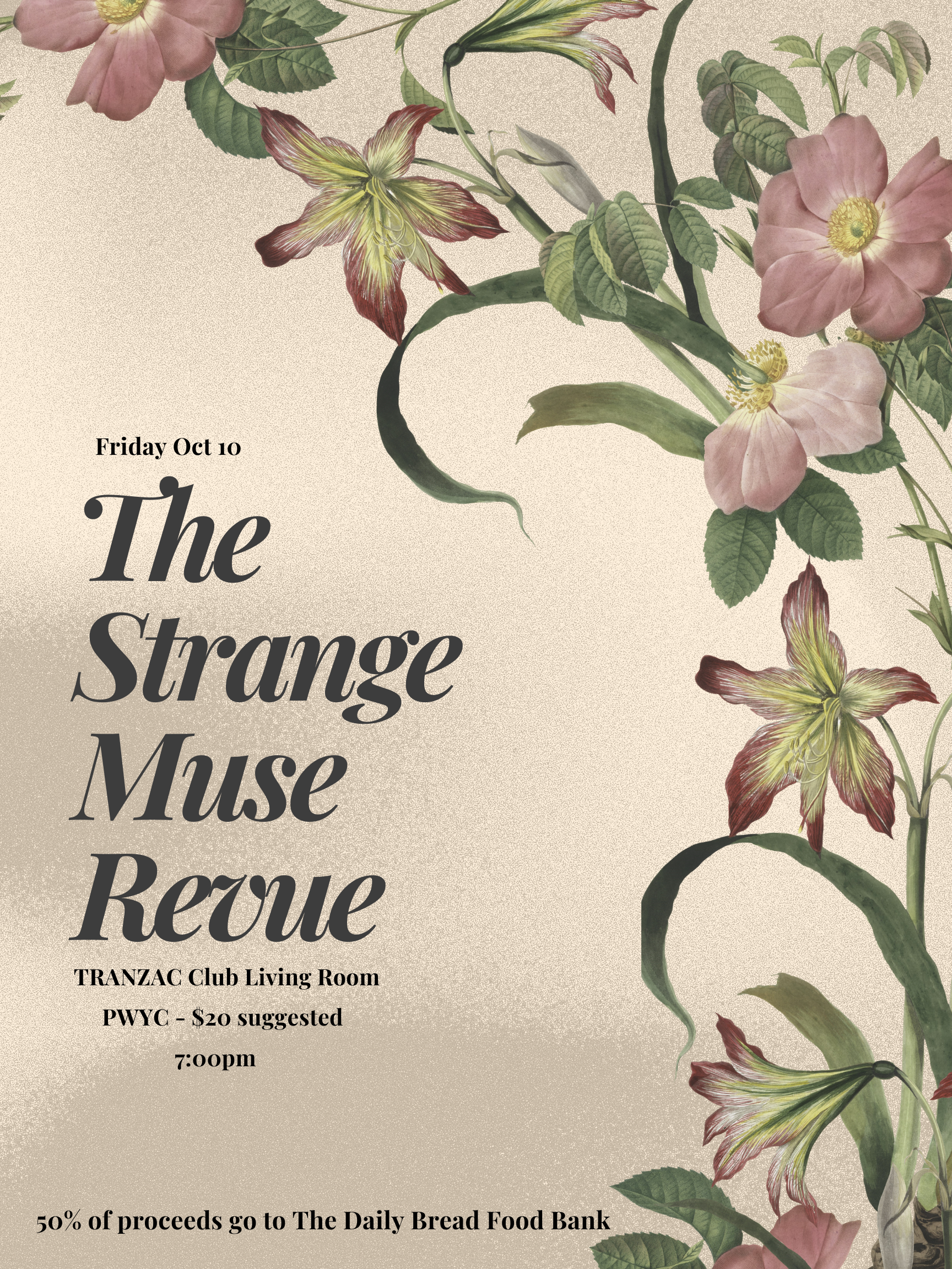 The Strange Muse Revue is a live literary revue featuring local writers, with 50% of proceeds donated to The Daily Bread Food bank.