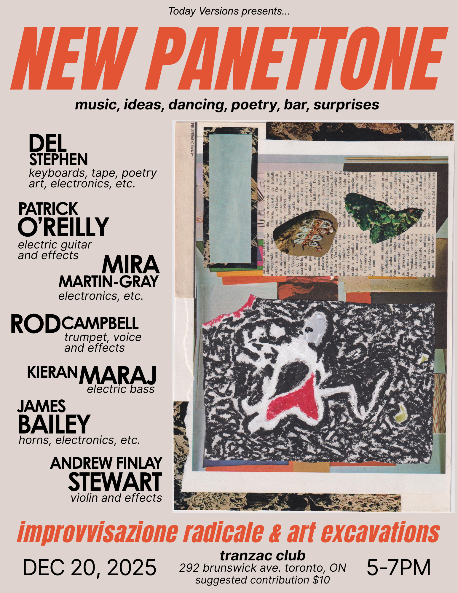 "Today Versions presents...NEW PANETTONE! Del Stephen brings together 6 creative artists (listed below) for an early evening of improvvisazione radicale and art excavations. The group, in various arrangements, will dive into some Free Music and also dig up new layers of meaning/direction/etc within some of Del Stephen's oil pastel poetry compositions and other experimental scores. Music, ideas, dancing, poetry, bar, surprises!