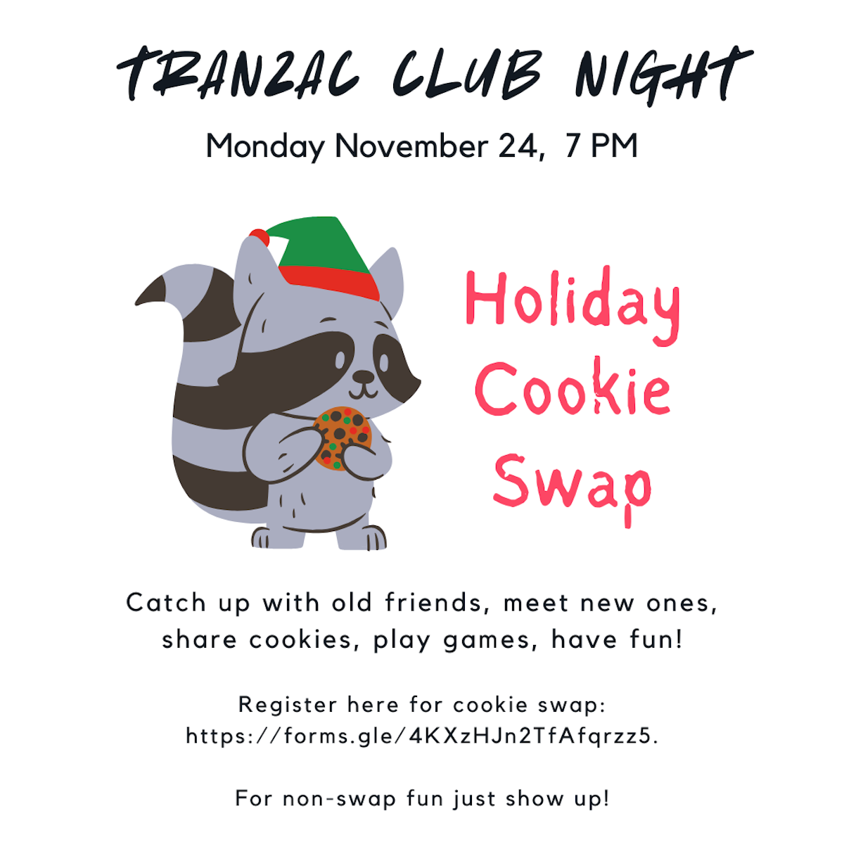 "Join us for the monthly Tranzac Club Night on November 24th to celebrate community, creativity, connection … and cookies! In addition to games and socializing, there will be a holiday cookie swap, with 20 spots available for registration using this form https://forms.gle/4KXzHJn2TfAfqrzz5. For non-swap fun just show up. 7 PM until late.