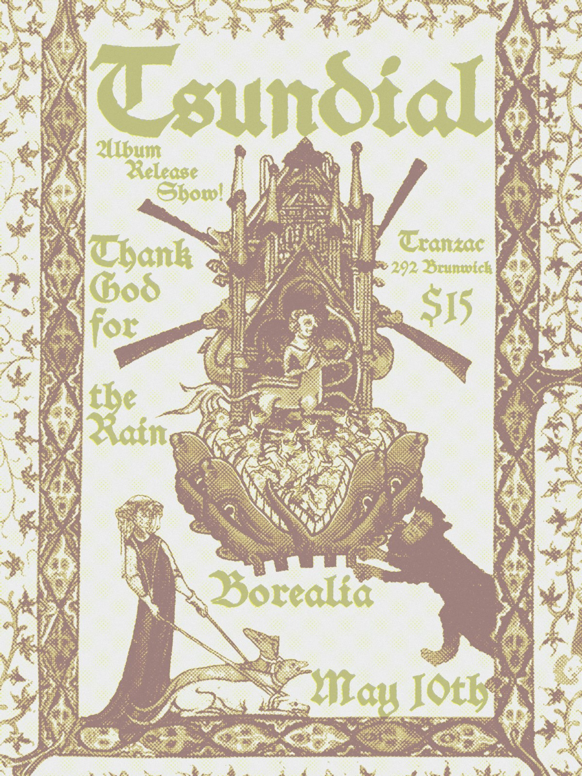 Come listen to Tsundial the band play for one final time. Hear their unique sound that is intense and full of surprises, drawing on math rock, blues, and grunge. Featuring tracks from their single, and from their soon to be released album. With Borealia and Thank God for the Rain.