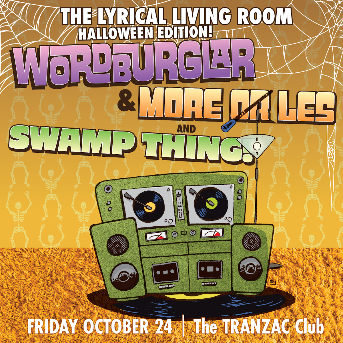 Wordburglar's Lyrical Living Room returns to the Southern Cross with special spooky guests SWAMP THING & MORE OR LES! Join Wordburglar and pals for another fun and funky night of old school head-nodding beats and rhymes! Friday Oct 24th in the Tranzac Southern Cross Ballroom 930pm, PWYC